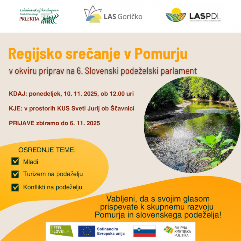 Tri lokalne akcijske skupine Pomurja – LAS Prlekija (vodilni partner Prleška razvojna agencija GIZ), LAS Goričko (vodilni partner Bistra hiša Martjanci) in LAS Pri dobrih ljudeh (vodilni partner Društvo za trajnost virov SI.ENERGIJA) – v sodelovanju z Društvom za razvoj slovenskega podeželja (DRSP) vabijo na regijsko srečanje v Pomurju, ki bo potekalo